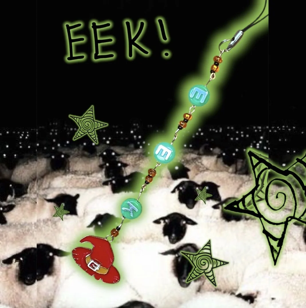 A digital illustration of a skeleton in the background with a cactus-shaped keychain hanging in front of it, featuring red skulls and green beads, with a green leaf charm attached.